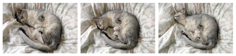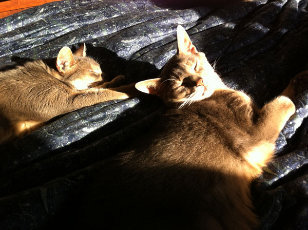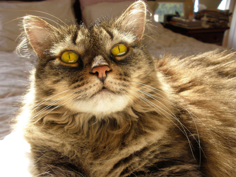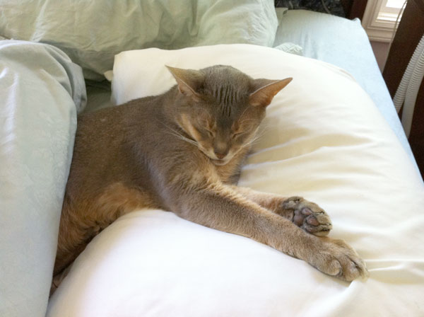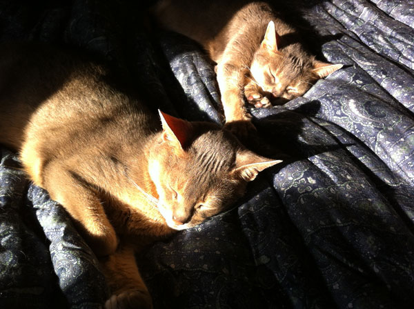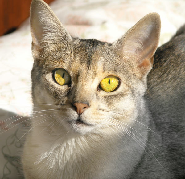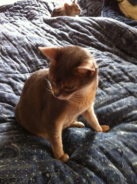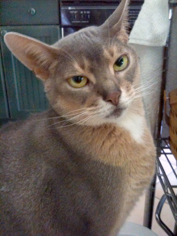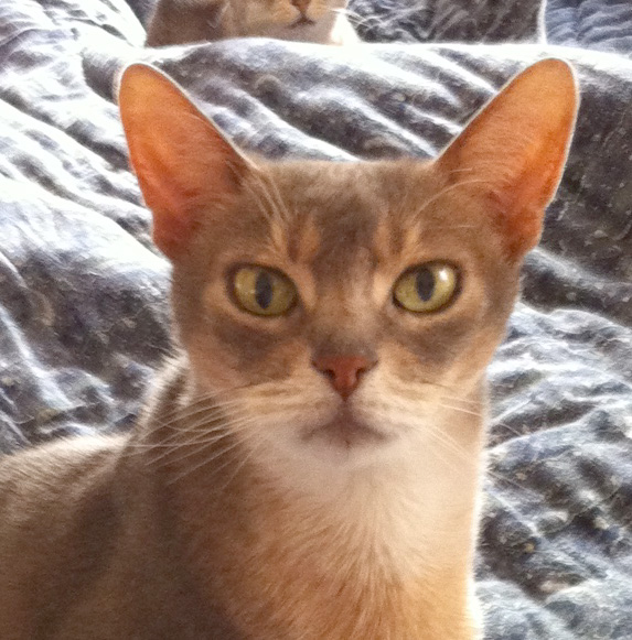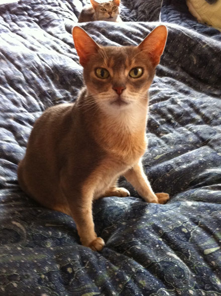 Sophie is a 4-year-old silver Abyssinian with a silver Somali grandfather. Meaning, she's soft and cute. Oh so cute... just ask Willow, he spends hours staring at her : ) She also weighs nothing, does 0-60MPH in .3 seconds, and is our Chief Dumpster Diver and Director of Nibbling. She often doesn't know what she's chewing on, but she has to taste it! Sophie loves to hide her little treasures. Beware when you put your shoes on Dad!